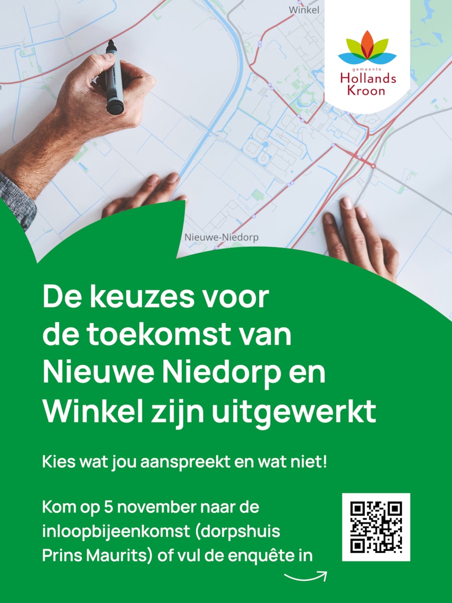 Kom op woensdag 5 november tussen 17.00 en 20.00 uur naar de inloopbijeenkomst in dorpshuis Prins Maurits. Hier ziet u de drie denkrichtingen, kunt u uw mening geven, vragen stellen en meedenken over wat het beste past bij de toekomst van Nieuwe Niedorp en Winkel.