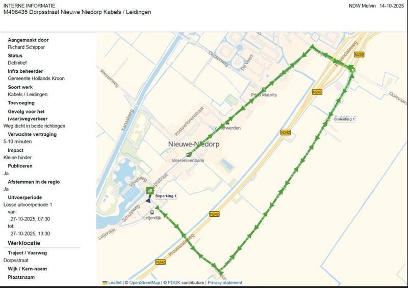 Wegens werkzaamheden aan kabels en leidingen in de hoofdrijbaan is de Dorpstraat afgesloten tussen de Schulpweg en Vijverweg.